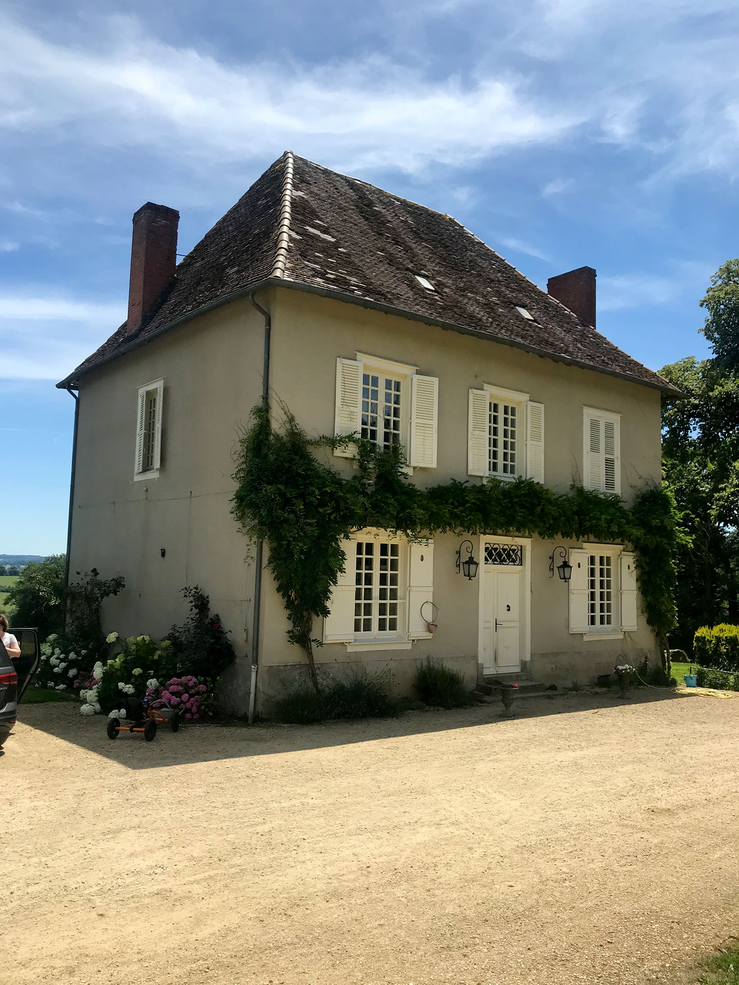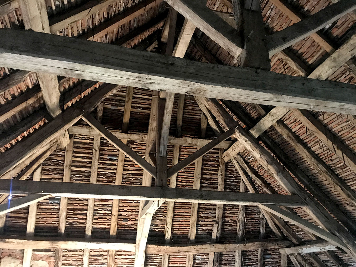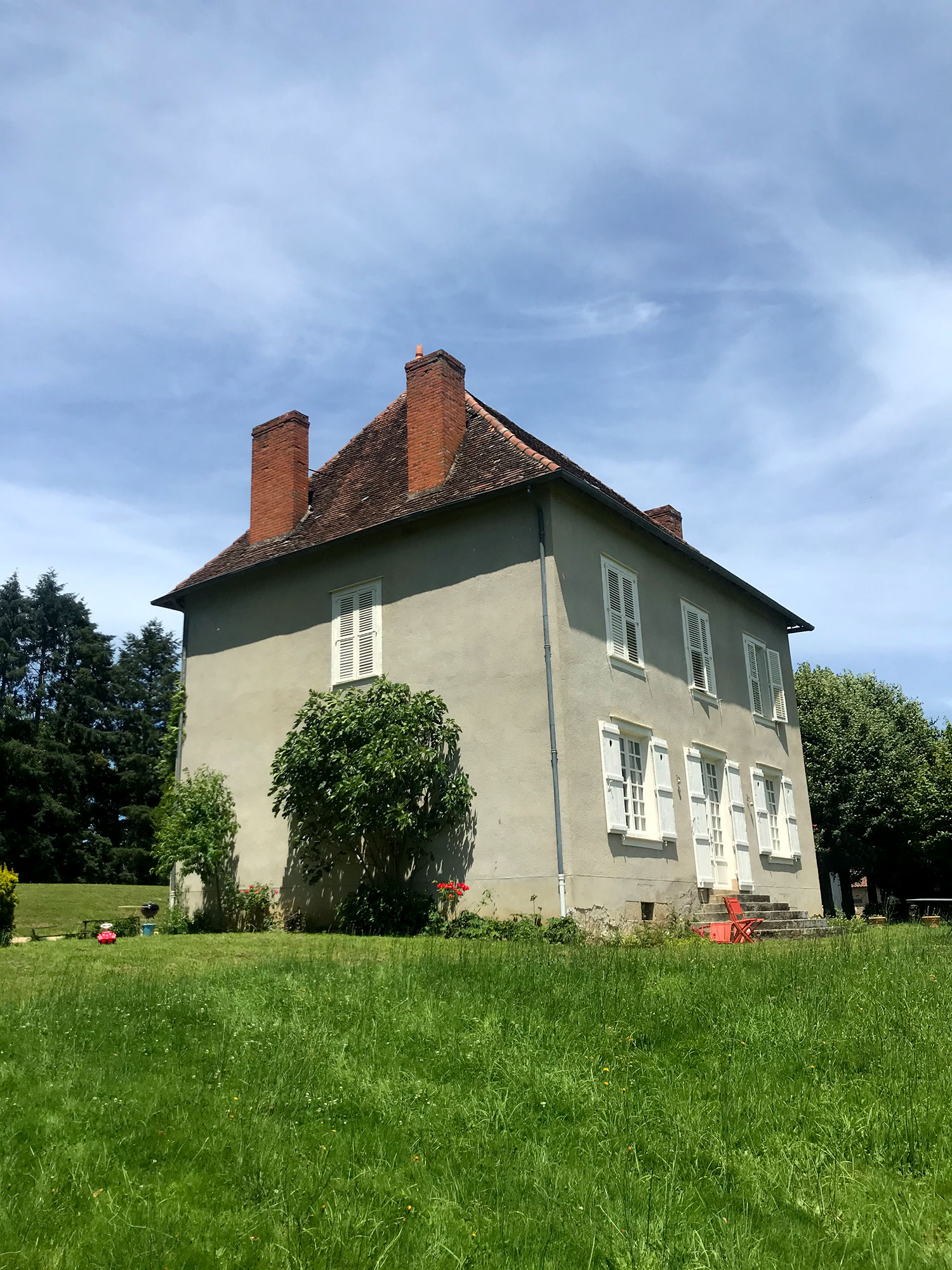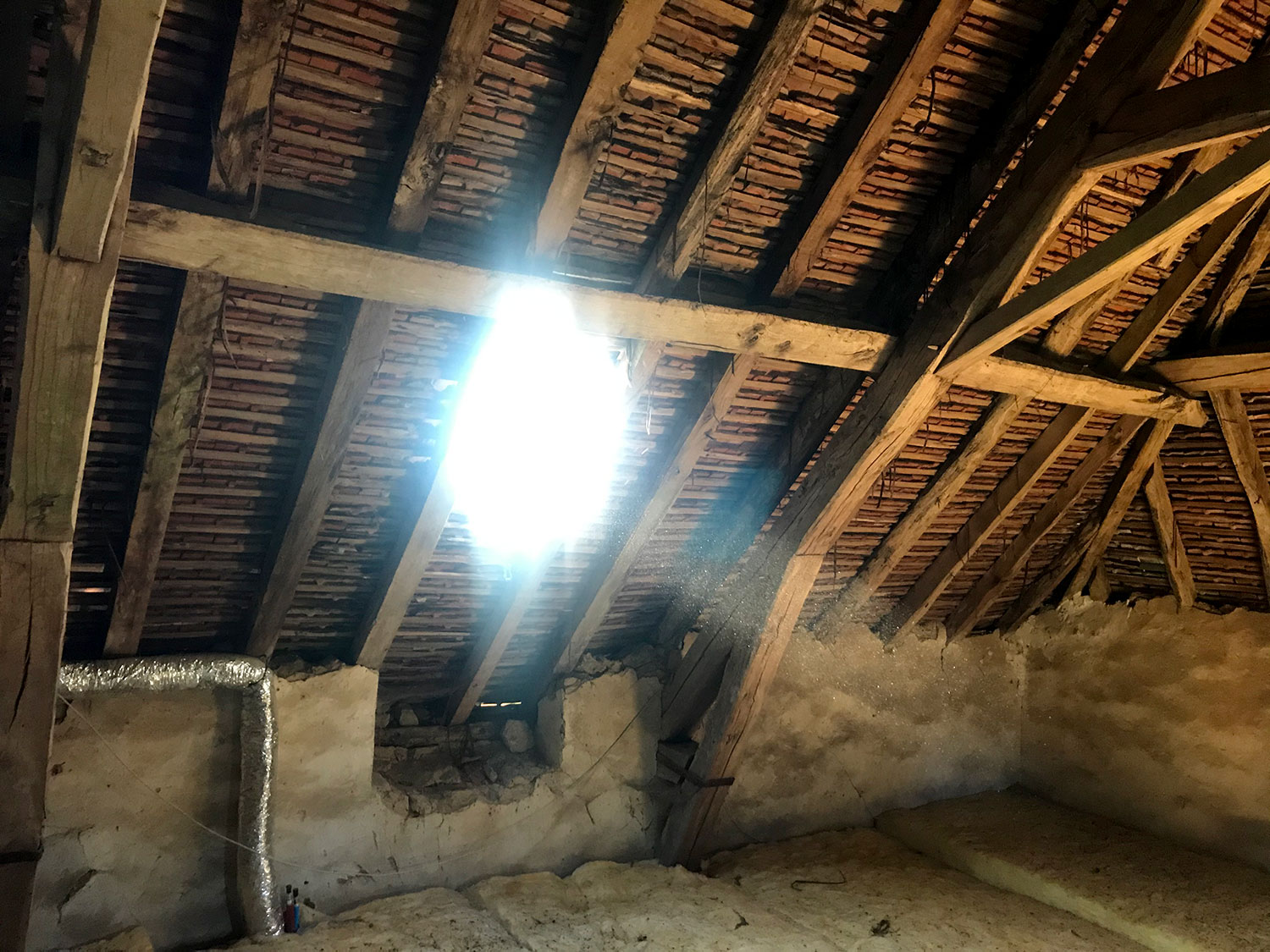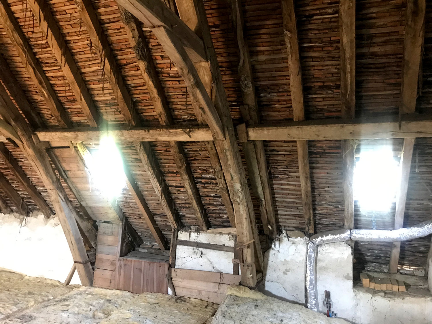 Cette maison limousine bénéficiant d’une belle hauteur sous charpente, le comble va être isolé et aménagé pour abriter trois chambres et une salle de bain. La couverture sera refaite à neuf en petites tuiles modèle patrimoine, et quatre lucarnes capucines seront taillées sur-mesure et posées à leurs anciens emplacements, toujours visibles dans la maçonnerie.